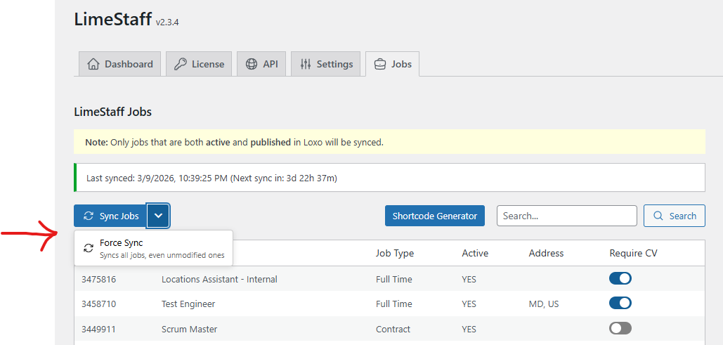 Job syncing is the process of importing and updating job listings from your Loxo account into your WordPress website using the LimeStaff plugin. This ensures your website always displays the latest job opportunities available in your Loxo system.